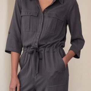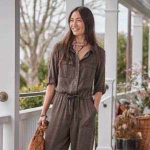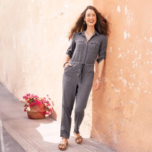 Our jumpsuit has a relaxed. button-front silhouette with beautiful drape. six pockets. drawstring tie. roll-tab sleeves and distressed metal buttons. Lyocell/viscose. Machine wash. Imported. Exclusive. Sizes XS (0 to 2). S (4 to 6). M (8 to 10). L (12 to 14). XL (16 to 18). XXL (20 to 22). Approx. 61L. 28-1/2 inseam.