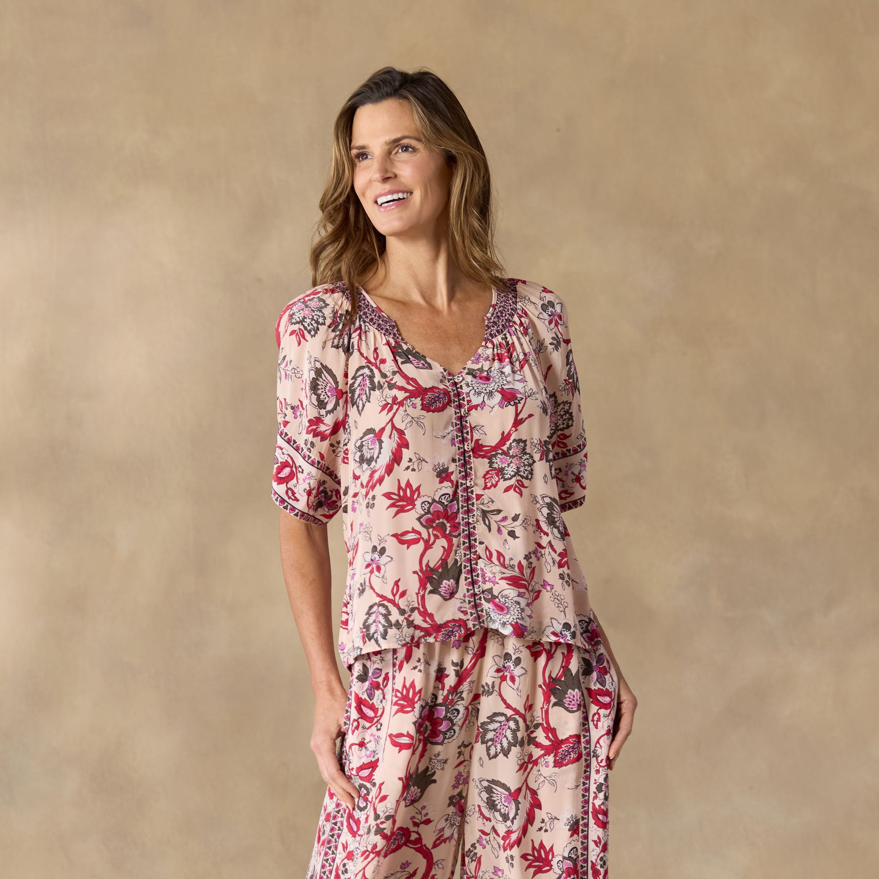 Silky and gorgeous mixed and border print pajama top. so elegant with smocked neckline and eyelet laundry button front. Easy fit. Viscose. Machine wash. Imported. Exclusive. Sizes XS (0?C2). S (4?C6). M (8?C10). L (12?C14). XL (16?C18). XXL (20?C22). Approx. 23l.