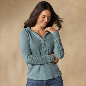 What do you get when you cross your favorite layering henley with your go-to lightweight hoodie? Introducing Caitlin. the most marvelous multi-tasker of the season??with tonal crochet details on the hood and sleeves. flattering seaming. a modern raw-edged placket and delicate henley buttons on an open V-neck. Cotton. Machine wash. Imported. Sizes XS (0?C2). S (4?C6). M (8?C10). L (12?C14). XL (16?C18). XXL (20?C22). Approx. 25l.