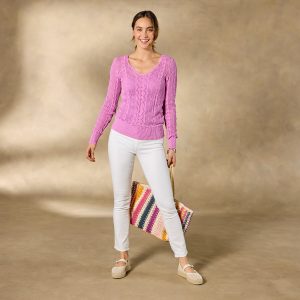 In cozy. lofty yarn. our crewneck sweater features a space-dyed intarsia yoke and sleeves. textural stitching with pointelle. cable stitch at cuffs and hem and feminine. volume sleeves. Cotton/polyester/acrylic/nylon/wool. Hand wash. Imported. Exclusive. Sizes XS (0?C2). S (4?C6). M (8?C10). L (12?C14). XL (16?C18). XXL (20?C22). Approx. 22.5l.