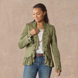 Contrasting velvet trim at the collar and welt pockets lends beauty to our fully lined jacket with ruffle and embroidery detail at the hem and sleeves. Filigree buttons. Cotton/spandex. Machine wash. Imported. Exclusive. Sizes XS (0?C2). S (4?C6). M (8?C10). L (12?C14). XL (16?C18). XXL (20?C22). Approx. 22l.