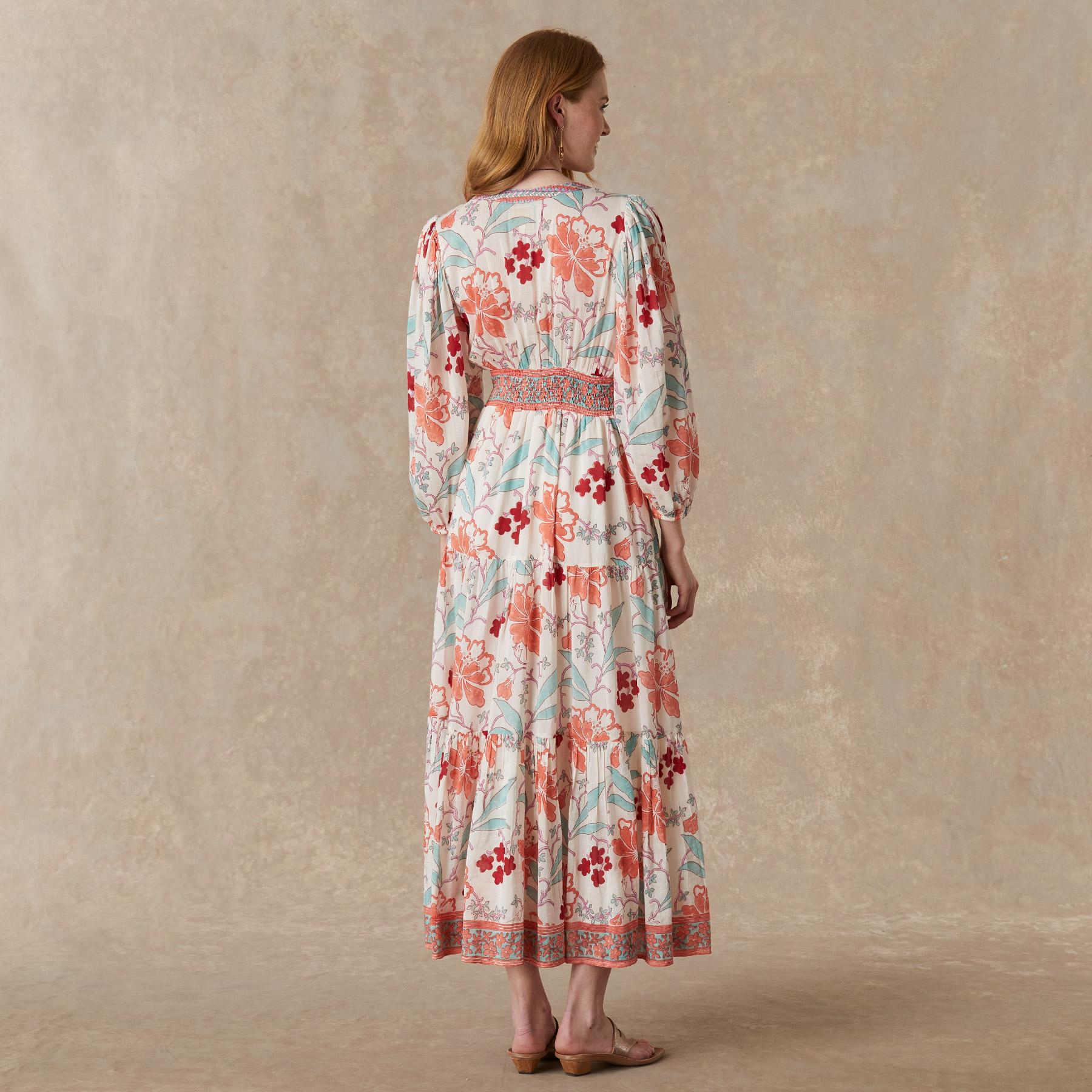 A bold floral with contrasting borders make this tiered maxi dress stand out. Features a beaded tassel at the waist. elastic at the cuffs and smocking on the back. Size up for a more true to size fit. Cotton/silk. Hand wash. Imported. Sizes XS (0-2). S (4-6). M (8-10). L (12-14). XL (16-18). Approx. 55l.