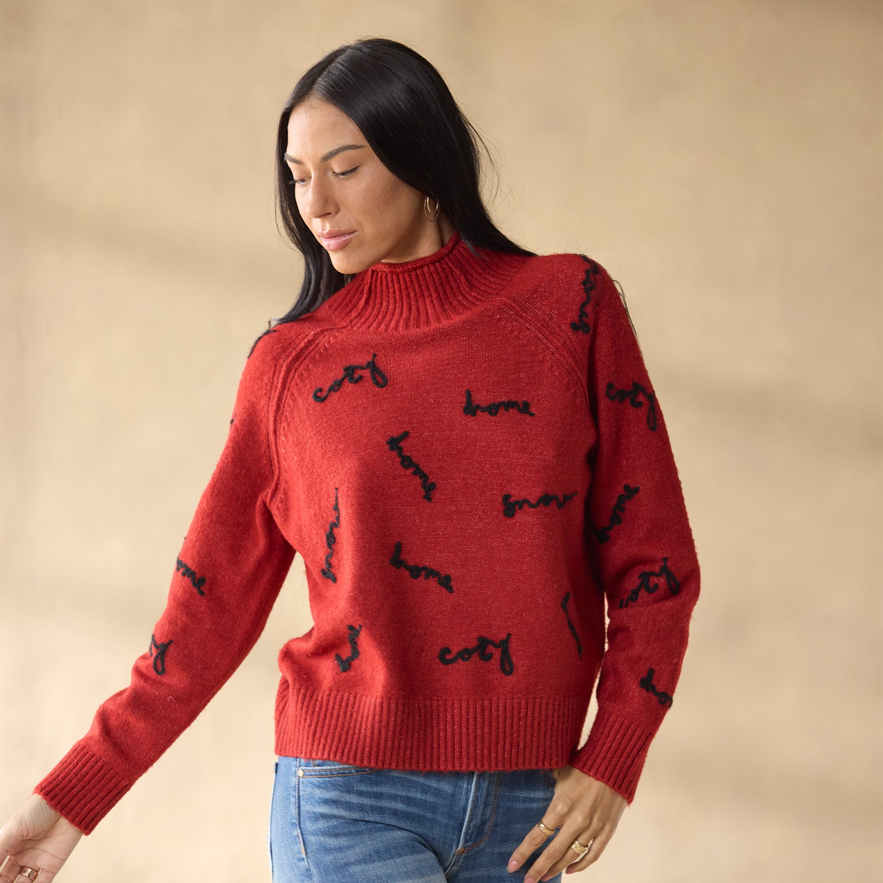 Our cozy sweater features the machine-embroidered sentiments cozy. home and snow. An allover rib with mock neck. rib trim. jersey roll neckline and exposed seaming at raglan sleeves. Acrylic/nylon. Hand wash. Imported. Exclusive. Sizes XS (0?C2). S (4?C6). M (8?C10). L (12?C14). XL (16?C18). XXL (20?C22). Approx. 23l.