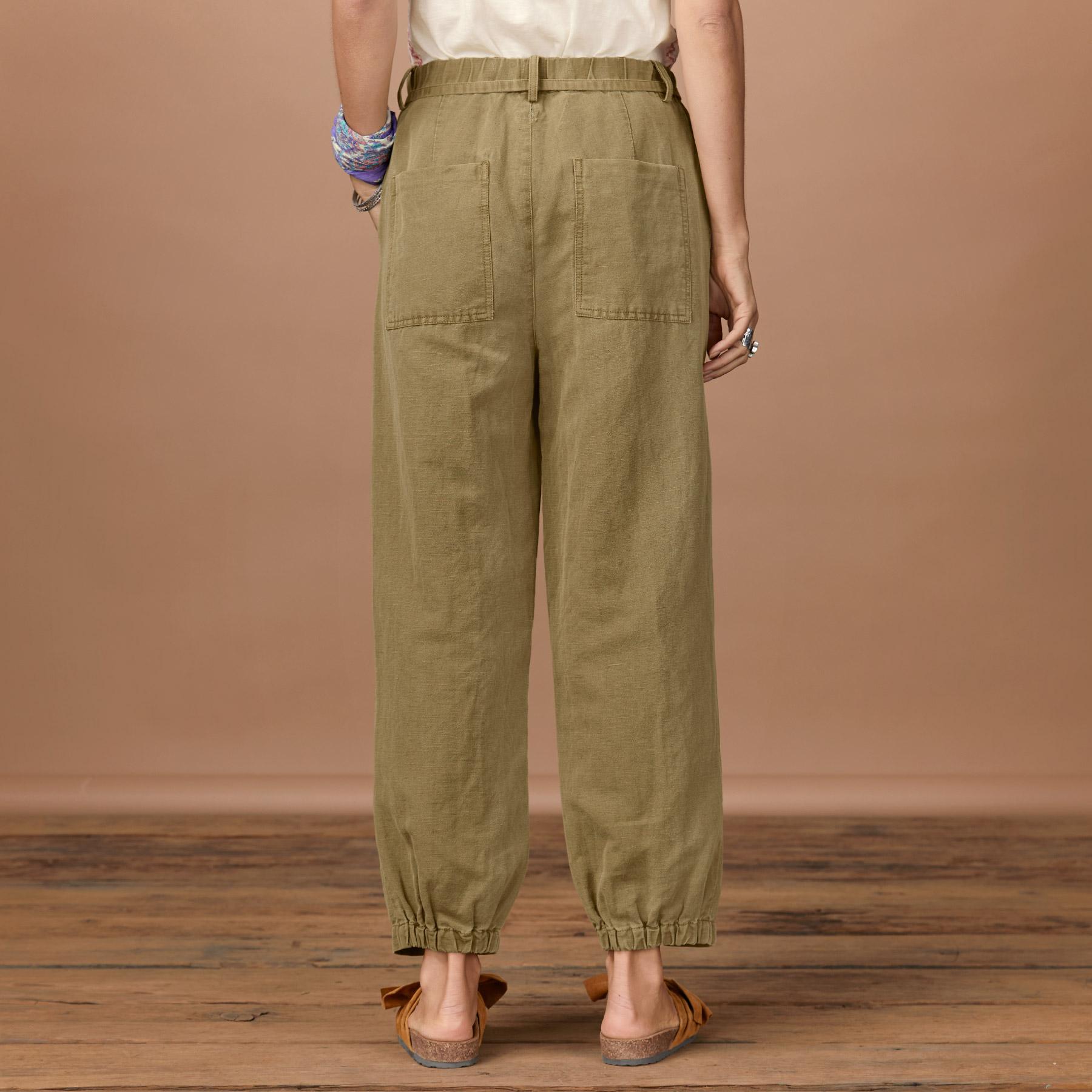Step into comfort with our relaxed fit barrel leg pants with easy flat front and elastic back waist for the perfect fit. Front pintuck details. two front slash pockets. two back patch pockets and a removable waistband tie. Cotton/linen. Machine wash. Imported. Exclusive. Sizes 2-16. 26 inseam.