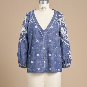 There’s joyful bohemian flair in this yarn-dyed top with luscious allover embroidery. blanket stitch details. three-quarter sleeves. shell buttons and V-neck. Full. easy fit. Cotton. Machine wash. Imported. Exclusive. Sizes XS (0 to 2). S (4 to 6). M (8 to 10). L (12 to 14). XL (16 to 18). XXL (20 to 22). Approx. 24-1/2L.