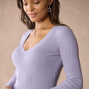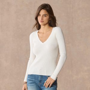Simple and sophisticated. our fitted. mixed rib stitch sweater. in Lightest Legends yarn. V-neck. Cotton/nylon/spandex. Machine wash. Imported. Exclusive. Sizes XS (0?C2). S (4?C6). M (8?C10). L (12?C14). XL (16?C18). XXL (20?C22). Approx. 24l.