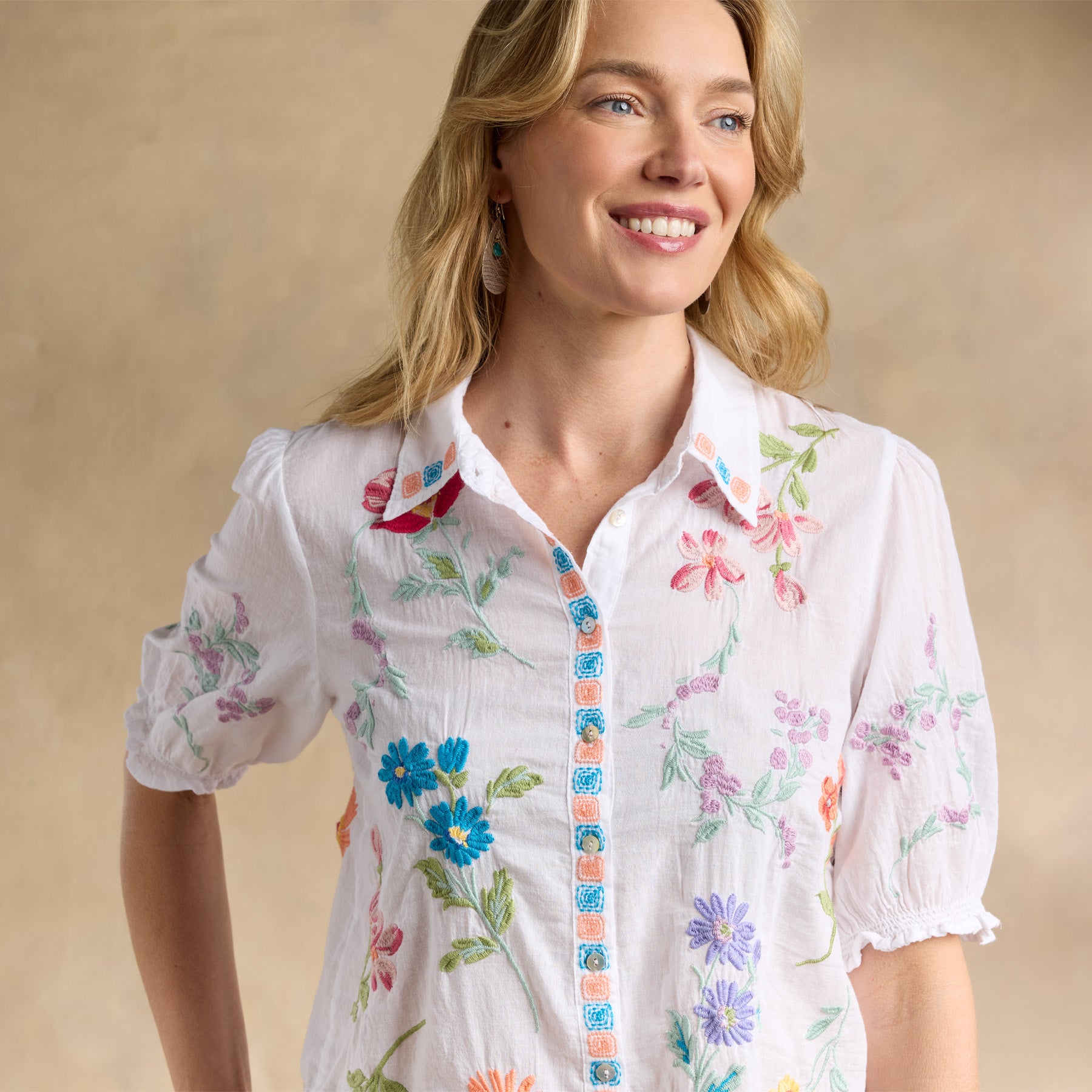 This gorgeous. collared. button-front shirt just exudes happiness with its rich color. allover embroidery. and short blouson sleeves with elastic cuffs and tiny ruffles. Shirttail hem. Cotton. Machine wash. Imported. Sizes XS (4). S (6). M (8??0). L (12). XL (14). XXL (16). Approx. 25.5l.