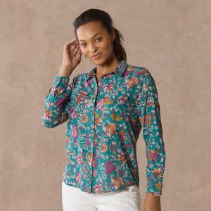 Cheerful floral print on our soft top with patch pockets. back yoke and button cuffs. Cotton. Machine wash. Imported. Exclusive. Sizes XS (0 to 2). S (4 to 6). M (8 to 10). L (12 to 14). XL (16 to 18). XXL (20 to 22). Approx. 27L.