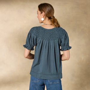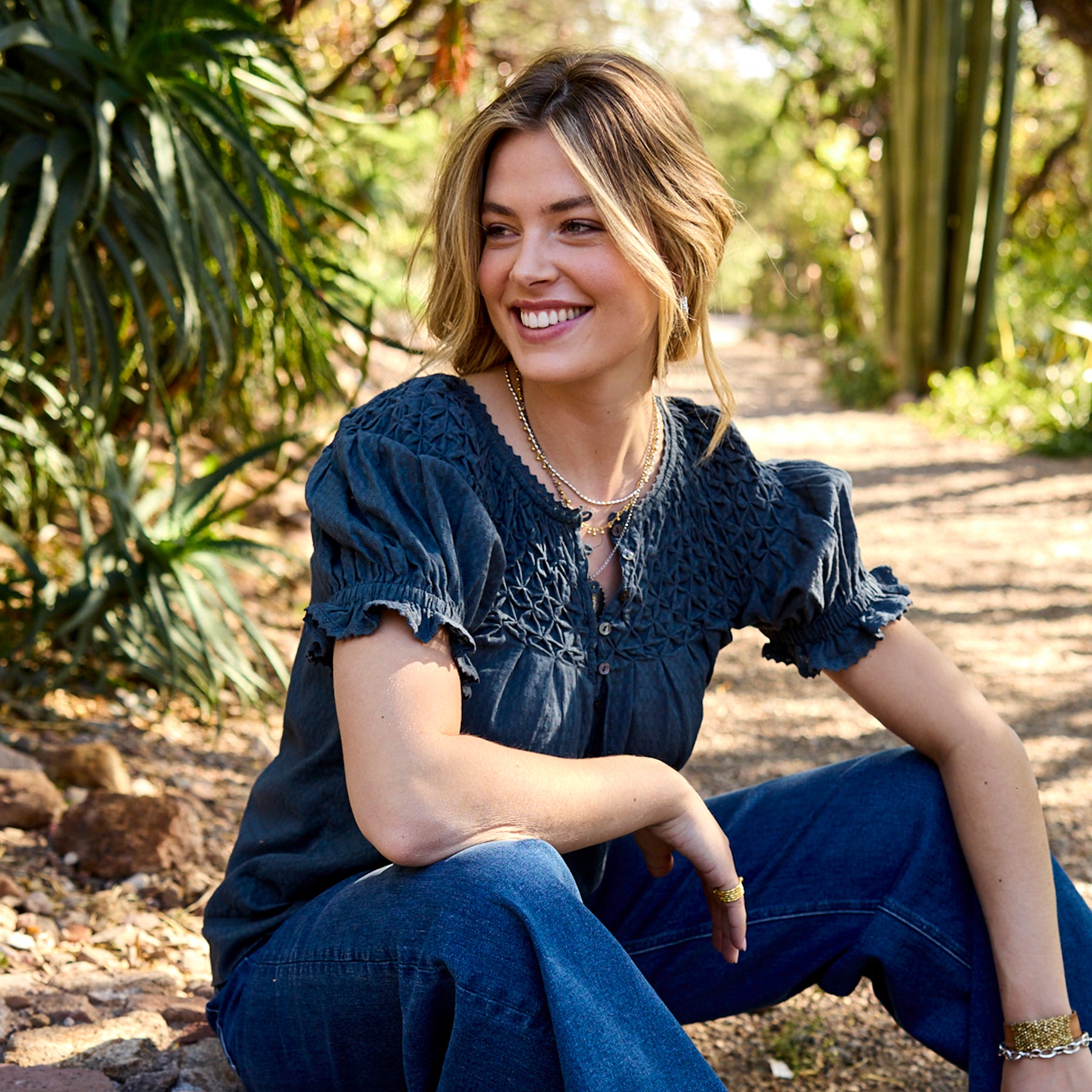 Feminine and textured. our Lodi Top is designed in bold colors with intricate details of lace and pineapple smocking. Button placket with loop closure. Elastic cuffs. Cotton. Machine wash. Imported. Exclusive. Sizes XXS (00). XS (0?C2). S (4?C6). M (8?C10). L (12?C14). XL (16?C18). Approx. 22.5l.