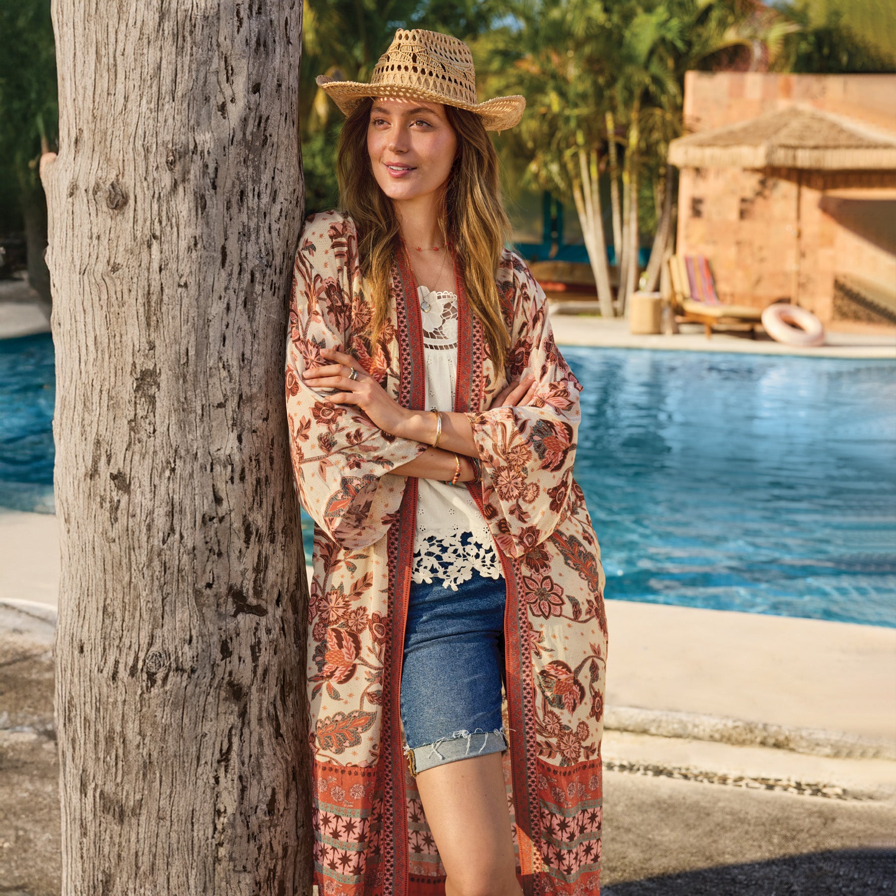 From morning coffee on the patio to apr??s-beach time and beyond. our easy. open-front kimono elevates your every day. With an elegant drape that will make you feel beautiful. charming border print and side-seam pockets. Viscose. Machine wash. Exclusive. Sizes XS (0?C2). S (4?C6). M (8?C10). L (12?C14). XL (16?C18). XXL (20?C22). Approx. 43.5l.