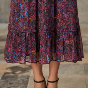 Graceful flutter sleeves and an artfully placed ruffle at the waist combine with a beautiful print. tie at neck and hook and eye closure. Viscose. Hand wash. Imported. Sizes XS (0-2). S (4-6). M (8-10). L (12-14). XL (16-18). Approx. 50.5l.