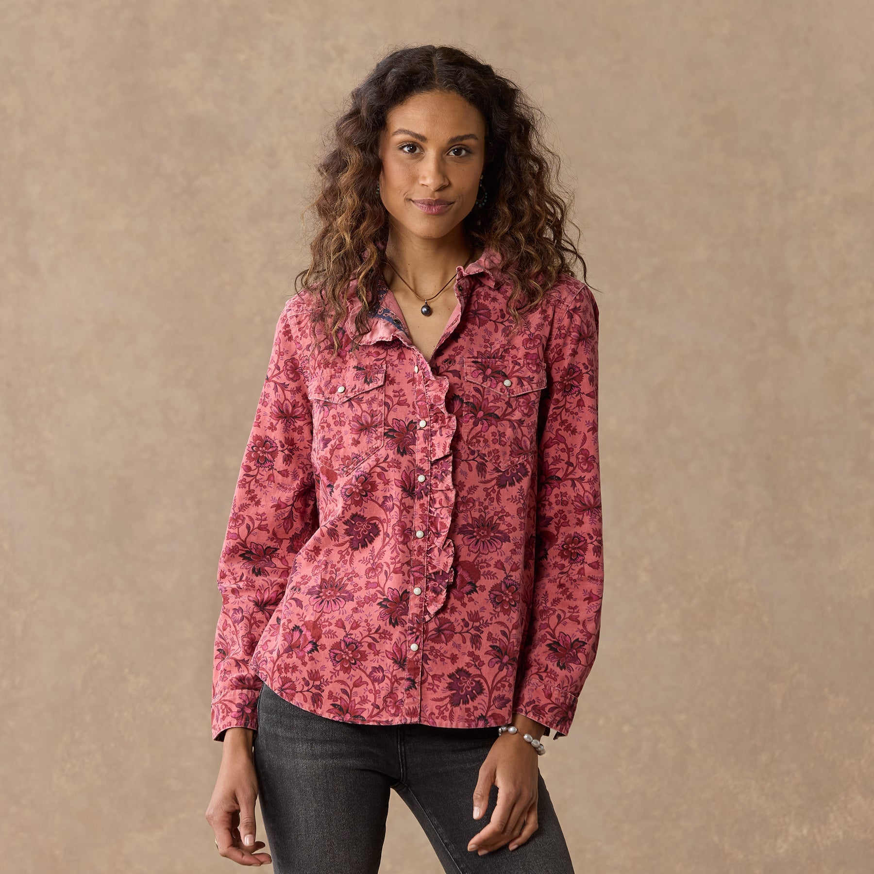 Floral printed and overdyed. this Western inspired. soft corduroy shirt is beautiful with ruffles at the neckline for a feminine twist. Two patch pockets. snap closure and bandana print detail inside. Cotton. Machine wash. Imported. Exclusive. Sizes XXS (00). XS (0?C2). S (4?C6). M (8?C10). L (12?C14). XL (16?C18). Approx. 24l.