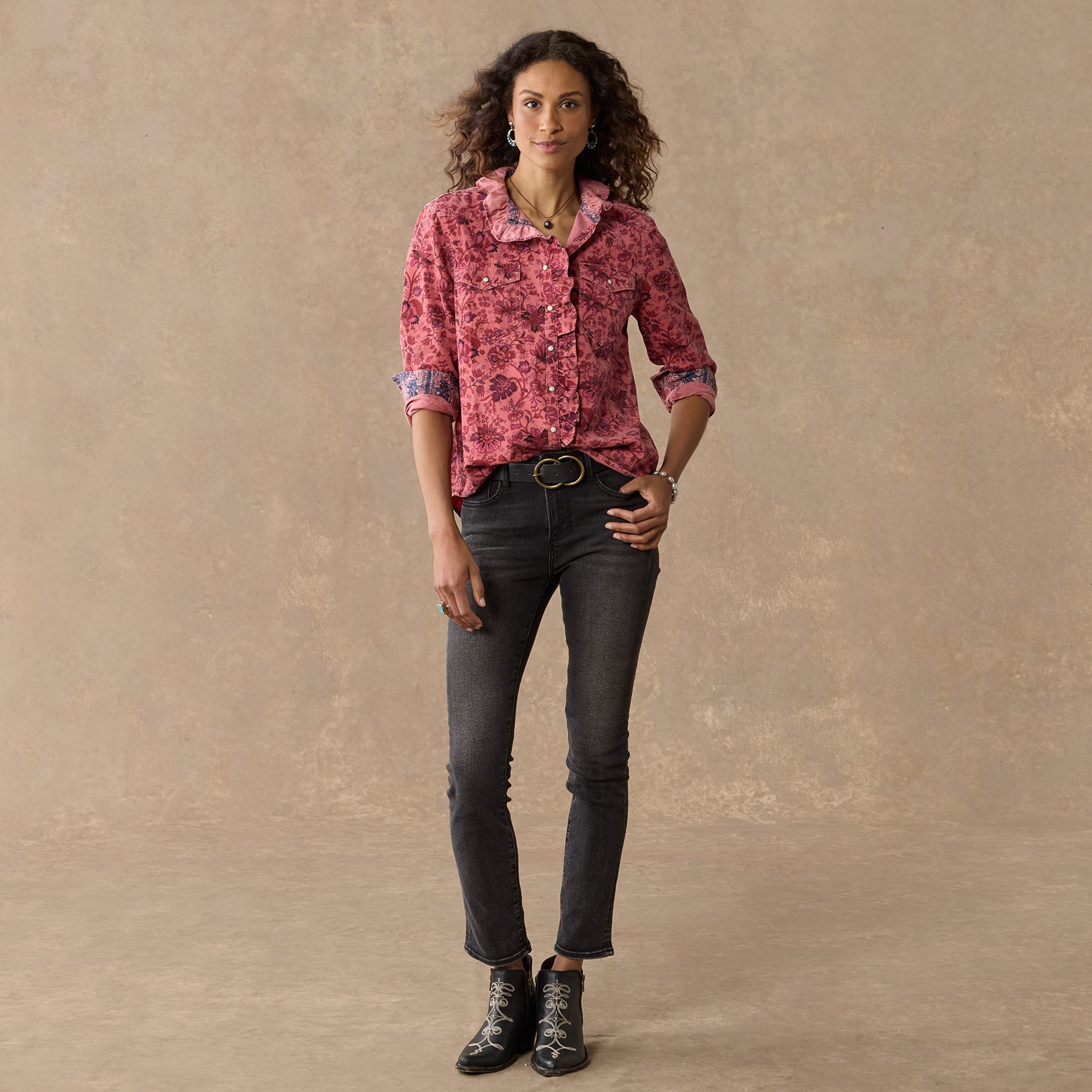 Floral printed and over-dyed. this Western inspired. soft corduroy shirt is beautiful with ruffles at the neckline for a feminine twist. Two patch pockets. snap closure and bandana print detail inside. Cotton. Machine wash. Imported. Exclusive. Sizes XS (0?C2). S (4?C6). M (8?C10). L (12?C14). XL (16?C18). XXL (20?C22). Approx. 26l.
