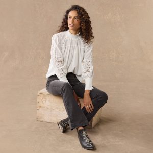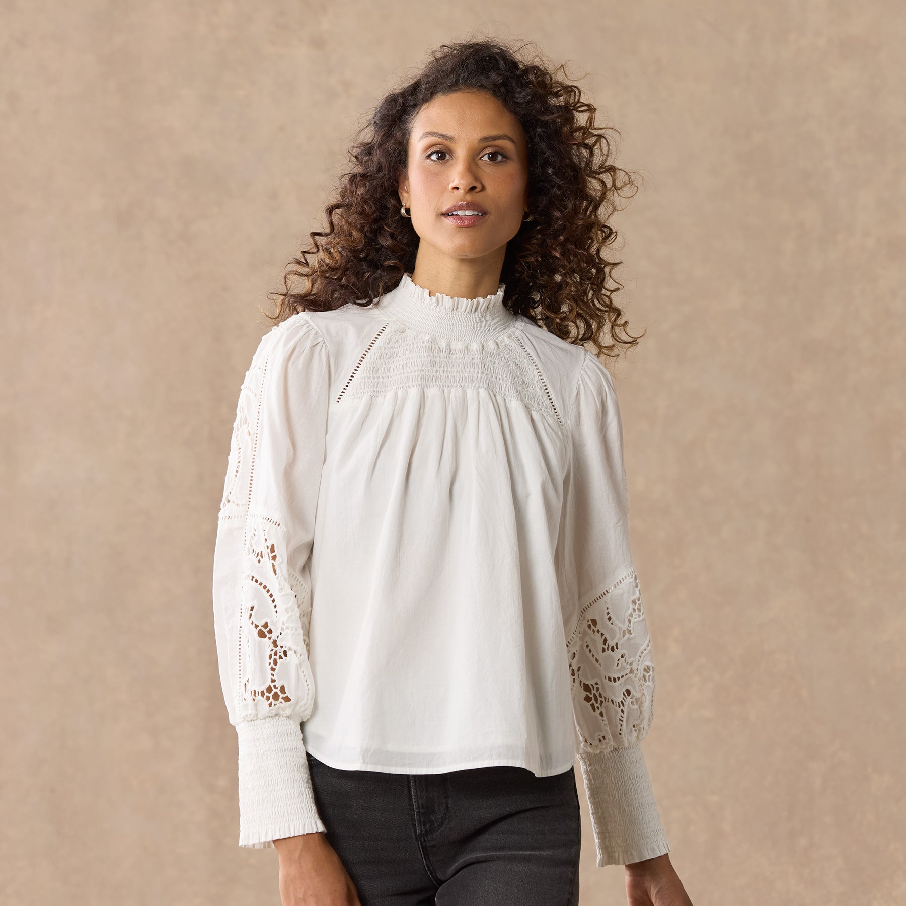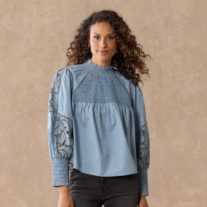 This ultra-feminine silhouette features smocking at the yoke and cuffs. ladder lace. lace insets and a ruffle at the neck. Cotton. Hand wash. Imported. Sizes XS (0?C2). S (4?C6). M (8?C10). L (12?C14). XL (16?C18). Approx. 23.25l.