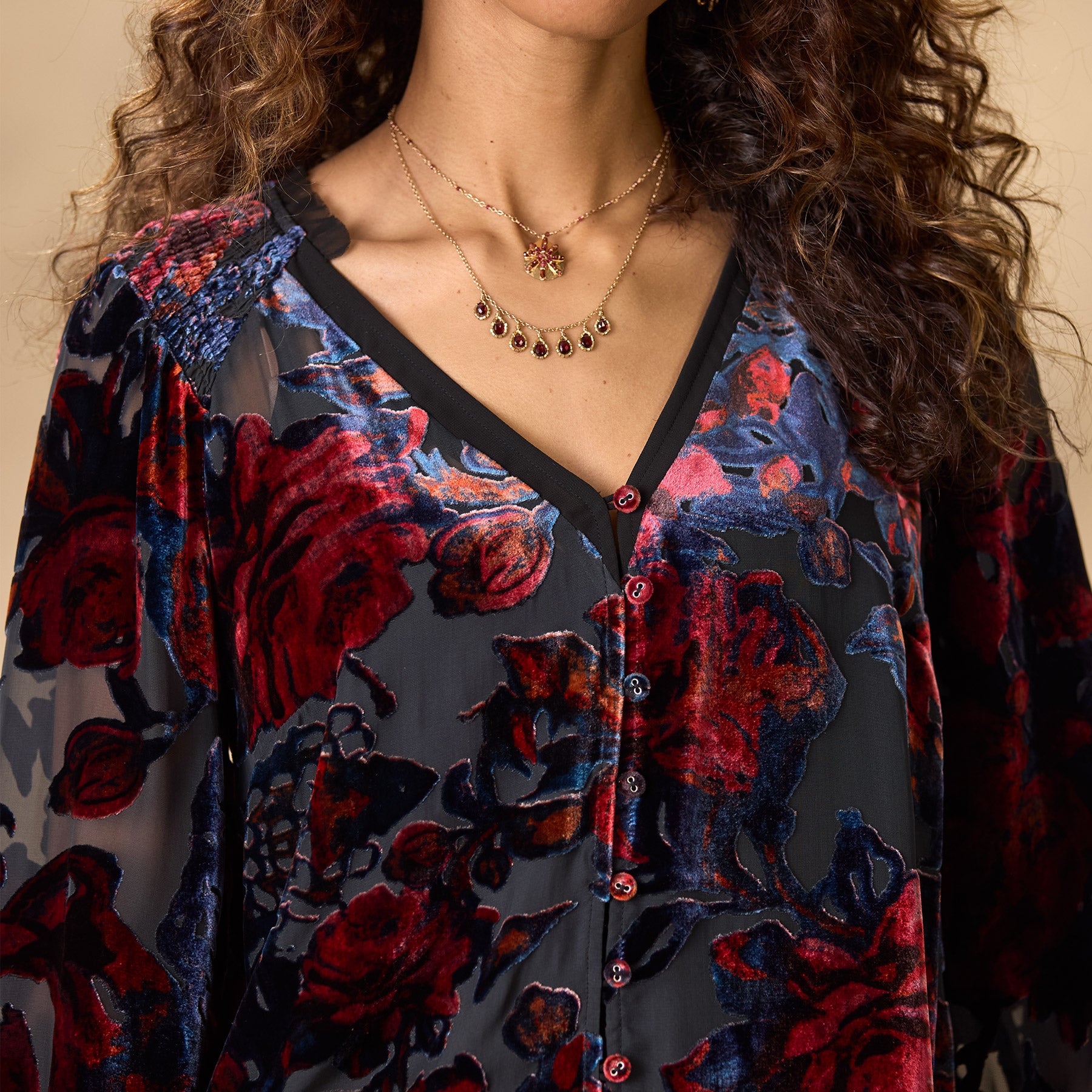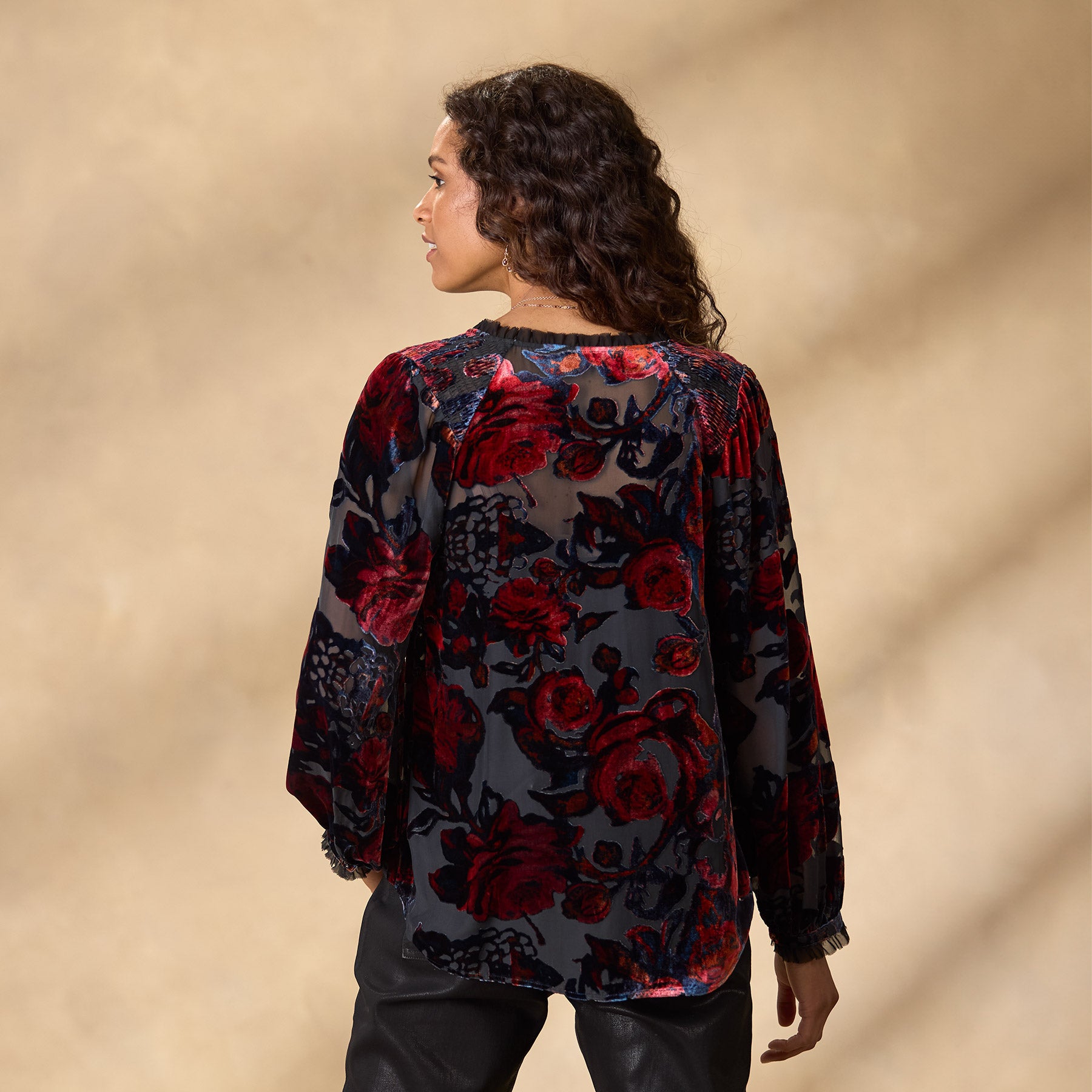Beautiful floral velvet burnout graces our easy and relaxed top with smocking at the shoulders. raw edge chiffon ruffles and a notch neckline. H-lo hem. Viscose/silk. Dry clean. Imported. Exclusive. Sizes XS (0?C2). S (4?C6). M (8?C10). L (12?C14). XL (16?C18). XXL (20?C22). Approx. 25l.
