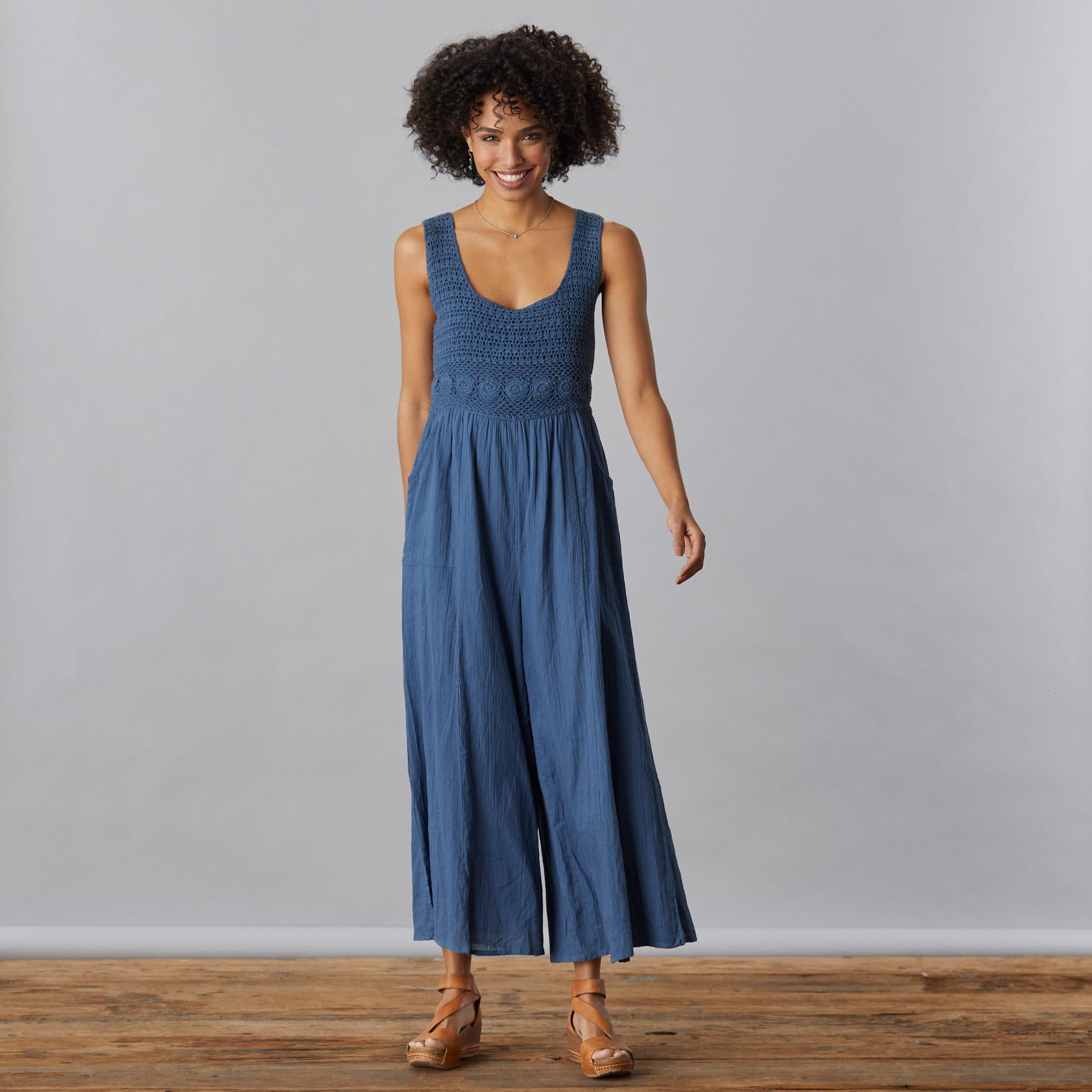 This light and airy. wide-leg jumpsuit features a sleeveless. crocheted bodice; zipper back and side pockets for a perfectly effortless. fair-weather outfit. Cotton. Machine wash. Imported. Exclusive. Sizes XS (0-2). S (4-6). M (8-10). L (12-14). XL (16-18). Front approx. 14-1/8l.