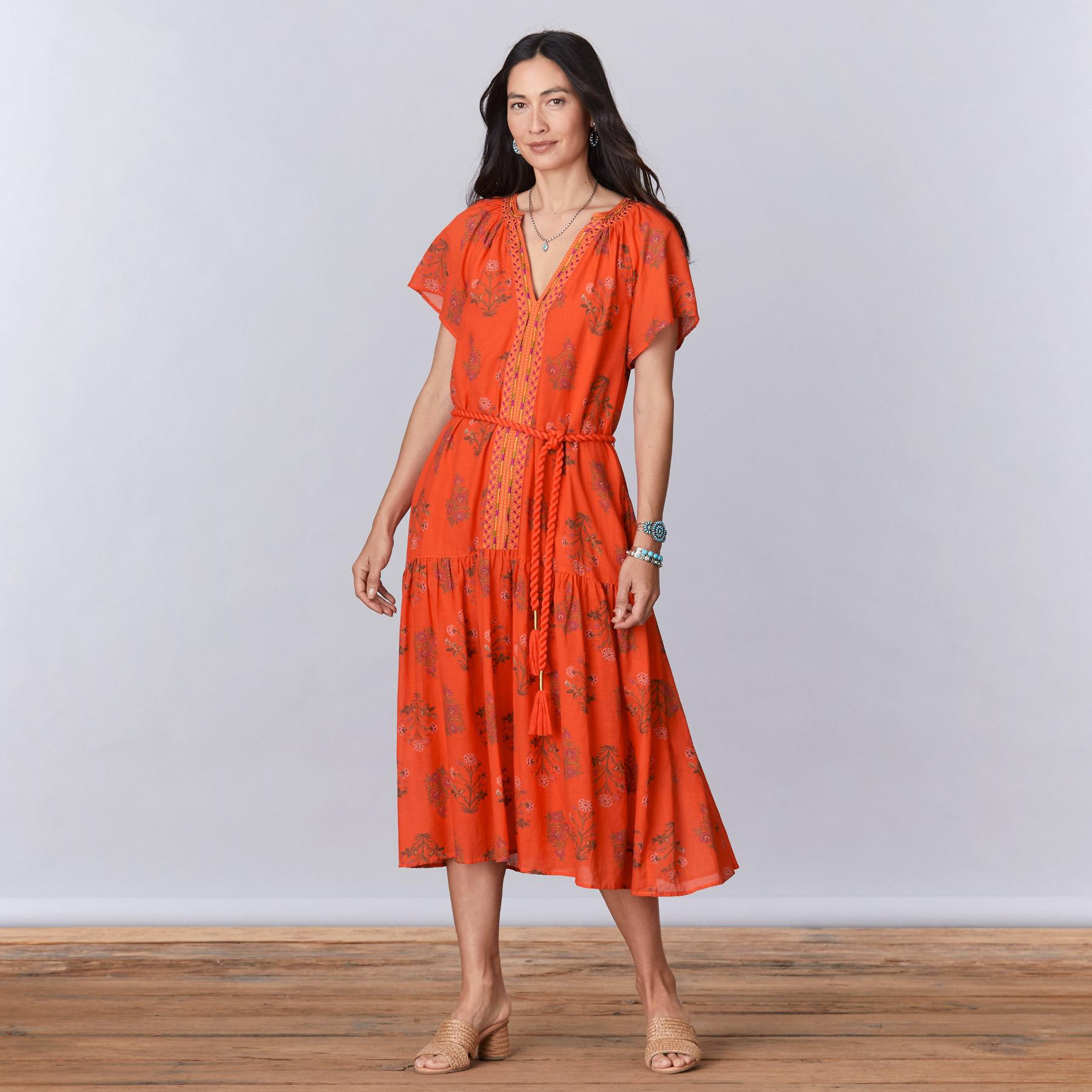 An ode to summer. our easy. flowing. floral print dress with geometric embroidery detail at neckline and placket. With one tier. flutter sleeves. notch neckline. side seam pockets and a removable ring loop rope belt. Lined. Cotton/viscose. Machine wash. Imported. Exclusive. Sizes XS (0??). S (4??). M (8??0). L (12??4). XL (16??8). XXL (20??2). Approx. 48l.