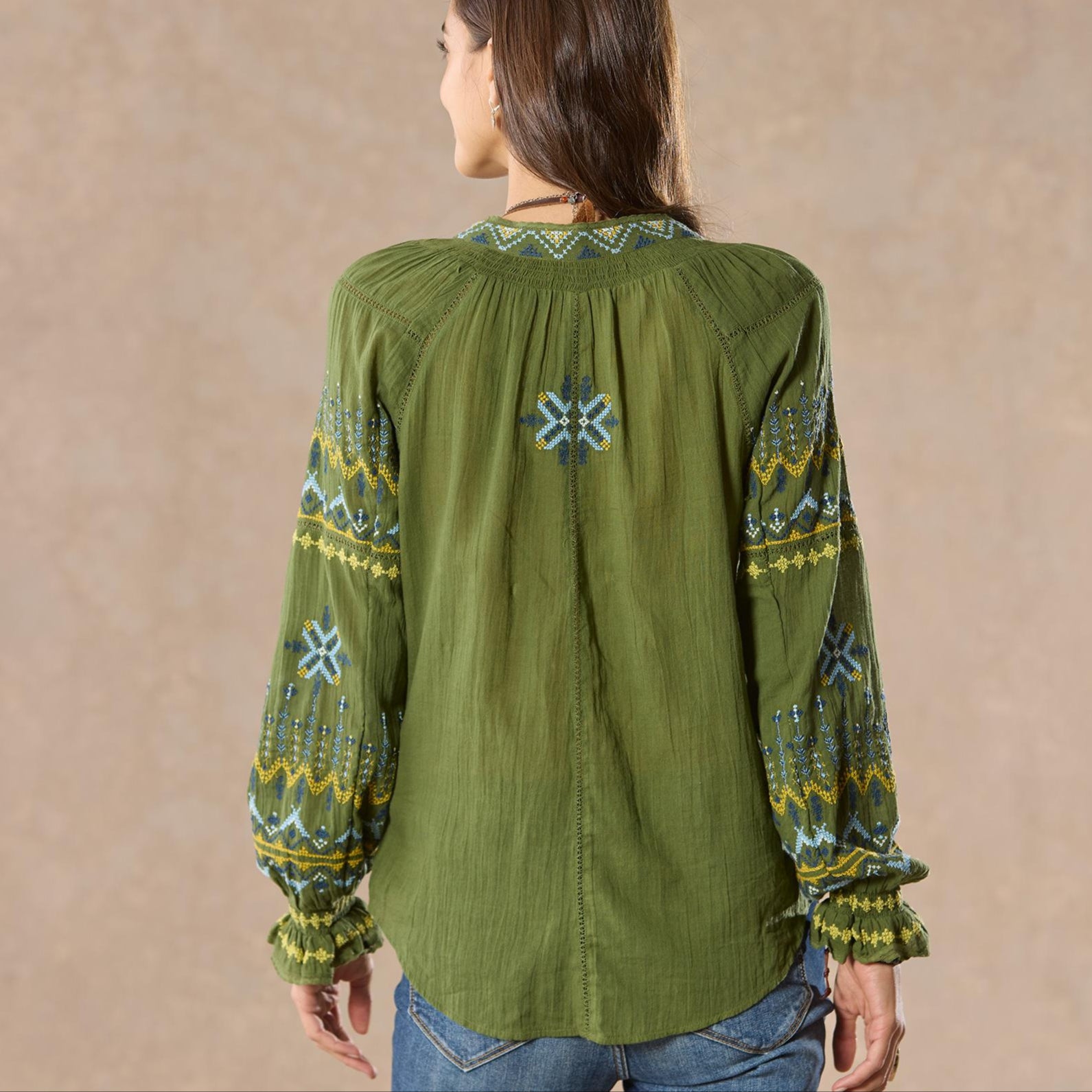 Our stylish peasant top is so flowy and breezy. cross stitched with colorful embroidery and finished with special lace insets. Elastic smocking at the cuff and notch neckline. colorful tassel ties. Cotton. Hand wash. Imported. Exclusive. Sizes XS (0?C2). S (4?C6). M (8?C10). L (12?C14). XL (16?C18). XXL (20?C22). Approx. 25l.