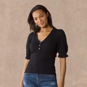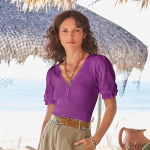 Experience the essence of luxury in our feminine and fitted V-neck henley. so soft in our Legends Lightweight Yarn. Beautiful pointelle at the bold puff sleeves and special scalloped trim details add an extra touch of grace. Organic cotton/nylon/spandex. Machine wash. Imported. Exclusive. Sizes XS (0??). S (4??). M (8??0). L (12??4). XL (16??8). XXL (20??2) Approx. 22.5l.