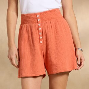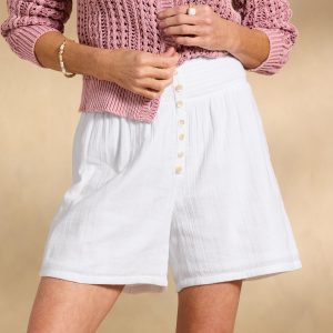 The easiest. breeziest warm weather shorts. with smocked elastic waistline and decorative pearl buttons. Pull them on and go anywhere in style. Cotton. Machine wash. Imported. Exclusive. Sizes XS (0?C2). S (4?C6). M (8?C10). L (12?C14). XL (16?C18). XXL (20?C22). 4 inseam